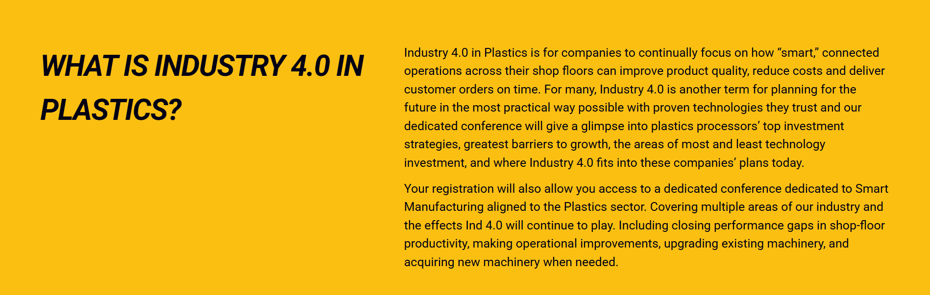Register your interest in attending Industry 4.0 in Plastics. Our dedicated conference will give a glimpse into plastics processors’ top investment strategies, greatest barriers to growth, the areas of most and least technology investment, and where Industry 4.0 fits into these companies’ plans today.
